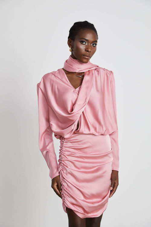 Ariane Pembe Dantel Panelli Drapeli Midi Elbise -